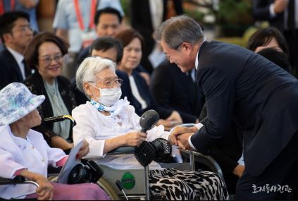 문재인 대통령은 지난 14일 기념식 연설에서 일본군 '위안부' 피해자 문제에 대해 "저는 이 문제가 한일 간의 외교분쟁으로 이어지지 않길 바란다"며 "양국 간의 외교적 해법으로 해결될 문제라고도 생각하지 않는다"고 말했다.