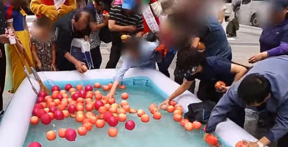 하지만 잠시 후 근처를 지나던 어르신들이 이벤트 체험을 하지 않고 무턱대고 "사과를 그냥 달라"며 손으로 진짜 사과를 건져내 가져갔다.