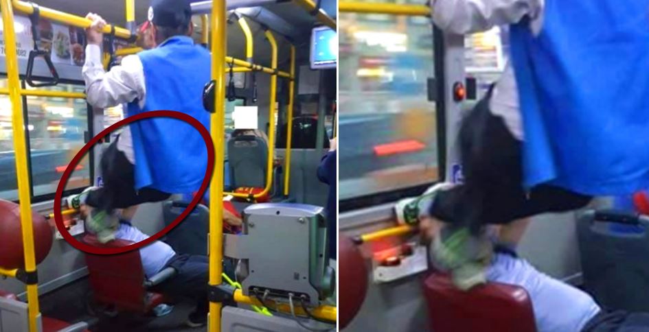 사진 속 노인은 버스 손잡이 윗부분 봉을 잡고 붕 날아올라 중년 남성에게 '하이킥'을 날리고 있다.