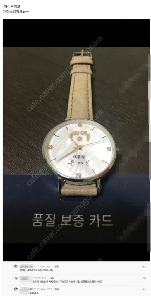 지난 4일 저녁 중고거래 커뮤니티로 유명한 네이버 카페 '중고나라'에는 '문재인 시계를 팔겠다'는 게시물이 올라왔다.