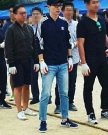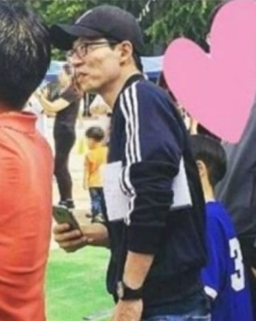 공개된 사진에는 편안한 청바지 차림에 스포츠 티셔츠를 입고 모자를 눌러쓴 유재석이 다른 학부모들과 함께 운동회에 참여하고 있는 모습이 담겨 있다.