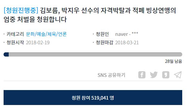 이같은 상황 속에 청와대 국민청원 홈페이지에서는 김보름 박지우 선수의 국가대표직 박탈과 함께 빙상연맹 처벌을 청원하는 게시글이 게시 이틀만에 청원 참여자가 50만명을 넘어섰다.