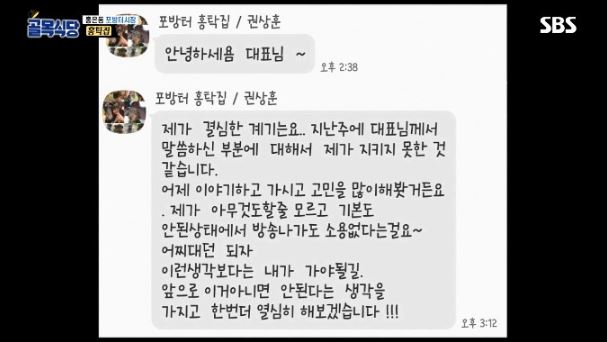 고민하던 홍탁집 아들은 백종원 대표에게 다시 해보겠다는 내용의 문자 메시지를 보냈다.
