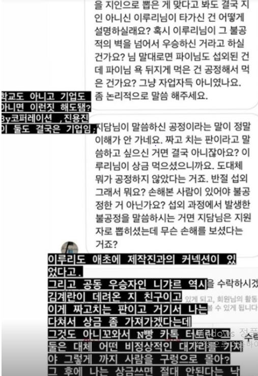 육지담은 또 한 누리꾼이 "'공정'이라는 말이 이해가 안간다. 짜고 치는 판이라고 말하고 싶은 거면 결국 아니잖냐. 이루리님이 상금 먹으셨으니. 도대체 뭐가 공정하지 않다는 거냐. 반절 섭외 그게 뭐냐. 손해본 사람이 있어야 불공정한 건데 섭외 과정에서 발생한 불공정을 말하는 거라면 지원자로 지담님이 뽑히셨는데 무슨 손해를 봤다는 거냐"라고 묻자 육지담은 "이루리도 애초에 제작진과 커넥션이 있었다"며 "공동 우승자인 니갸르 역시 김계란이 데려온 지 친구이고, 이게 짜고 치는 판"이라고 주장했다.