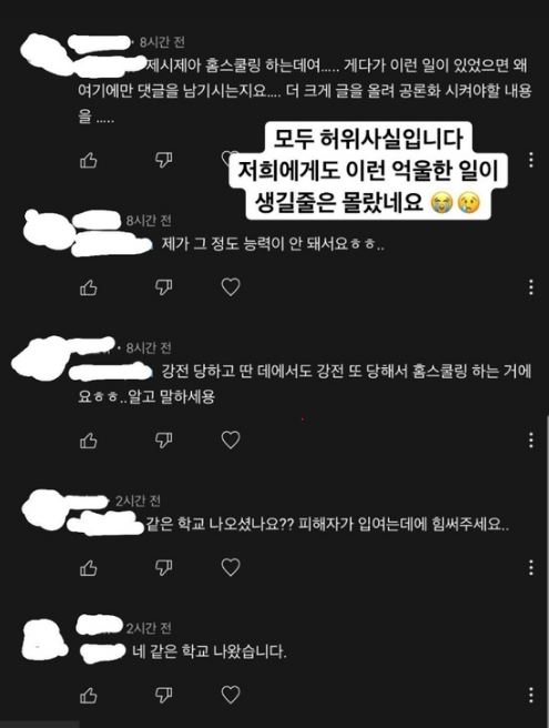 이에 대해 이재아는 "저와 재시는 채드윅 국제학교에 다닌 적도 없고 다른 학교에서도 강제전학을 당한 적이 없습니다. 저와 재시는 5년간 홈스쿨링을 했으며 이 댓글은 허위 사실입니다. 악성루머 및 허위사실 유포는 명백한 범죄입니다"라고 반박했다.
