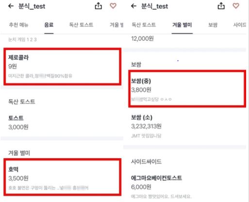 공개된 사진에는 '분식_test'라는 업체명과 추천메뉴, 음료, 독산 토스트, 겨울 별미, 보쌈 등 메뉴들이 적혀 있었다. 상호와 메뉴는 일반 식당과 다르지 않았으나, 소개란에 "테스트 계정"이라고 적혀 있었다.