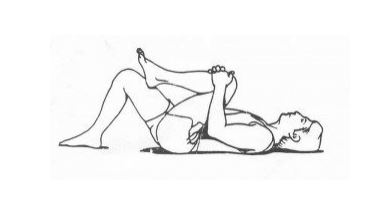2. 1번과 같이 누운 후 무릎을 구부린 후 무릎을 두 손으로 쥐고 20초 동안 몸통 쪽으로 당겨준다.