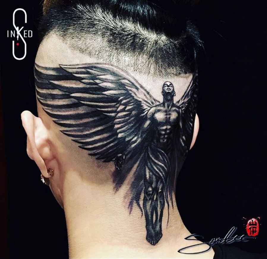 천사 문신은 목덜미까지 내려와 뒤통수 전부를 덮었다.
