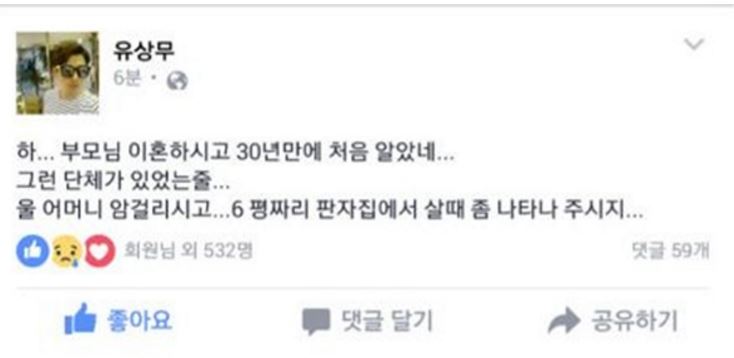 4월 10일 유상무는 자신의 페이스북에 "부모님 이혼하시고 30년 만에 처음 알았다. 그런 단체있었는줄... 우리 어머니 암 걸리시고, 6평짜리 판자집에서 살 때 좀 나타나 주시지"라고 썼다.