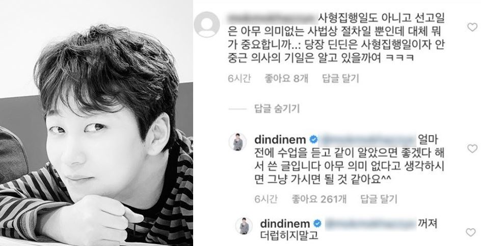 딘딘이 안중근 의사 사형선고일도 기억하자고 말했다가 이를 두고 비아냥댄 한 누리꾼에게 일침을 가하며 강하게 맞섰다.