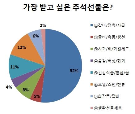 어느덧 추석이 보름 앞으로 다가왔다. 소비자들이 가장 받고 싶은 추석 선물은 무엇일까? 온라인종합쇼핑몰 롯데닷컴(www.lotte.com) 설문조사 결과 가장 받고 싶은 추석선물은 ‘갈비·정육