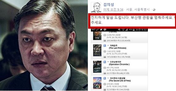 지난 14일 김의성은 자신의 페이스북을 통해 "영화 '부산행'